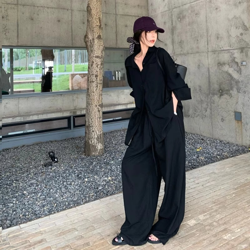 Elegant Polo Collar Shirt Top Loose Feeling Suit Female Autumn Leisure Wide-leg Pants